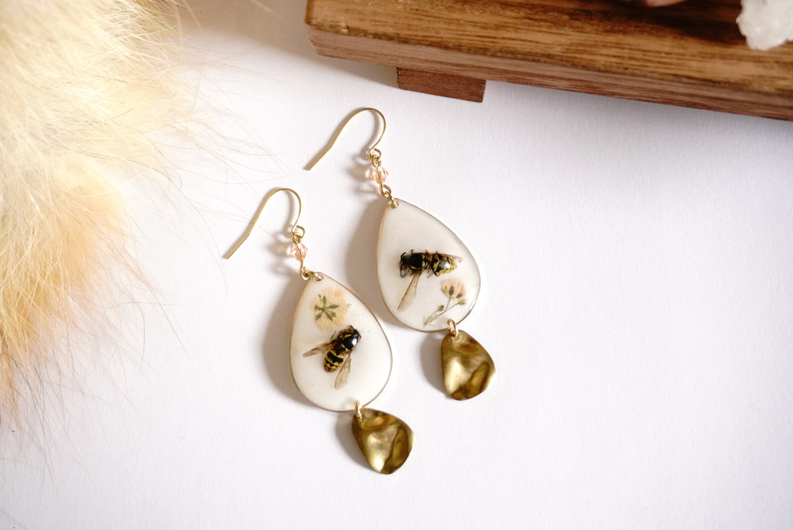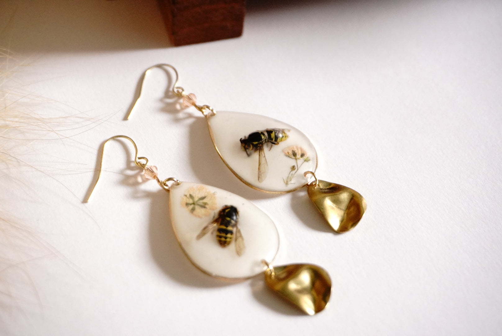 Buzz-worthy statement pieces that showcase nature's delicate beauty! These handmade earrings feature real pressed flowers paired with ethically sourced wasps (found after their natural passing). Each unique creation captures a moment of wilderness in wearable art. Perfect for those who dare to make a conversation-starting fashion statement!