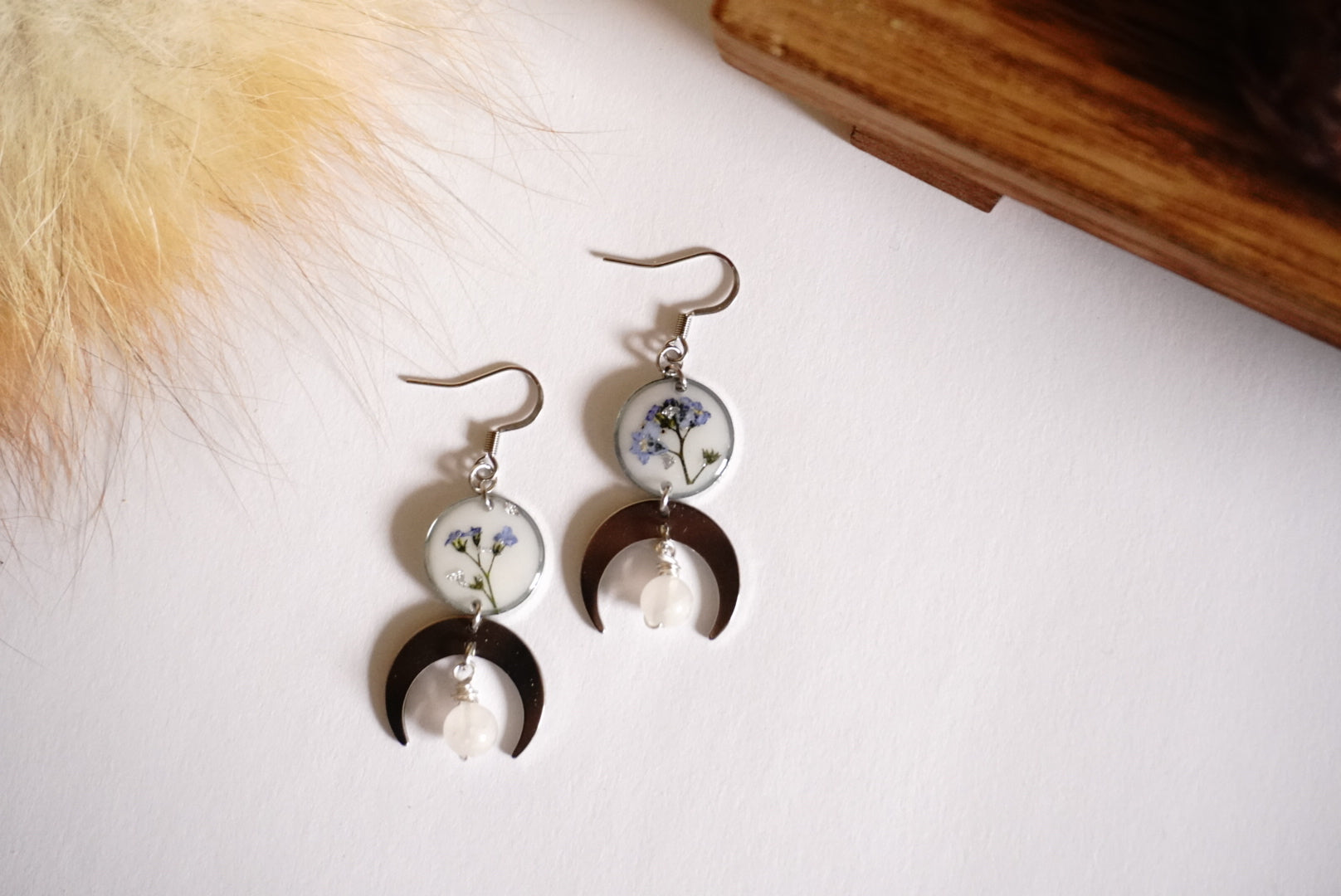 Capture the magic of nature with these whimsical handmade earrings! Real pressed forget-me-not flowers dance alongside charming crescent moons, while rose quartz stones dangle playfully below. These celestial beauties bring a touch of enchanted garden to your jewelry collection—perfect for moon-loving flower enthusiasts!