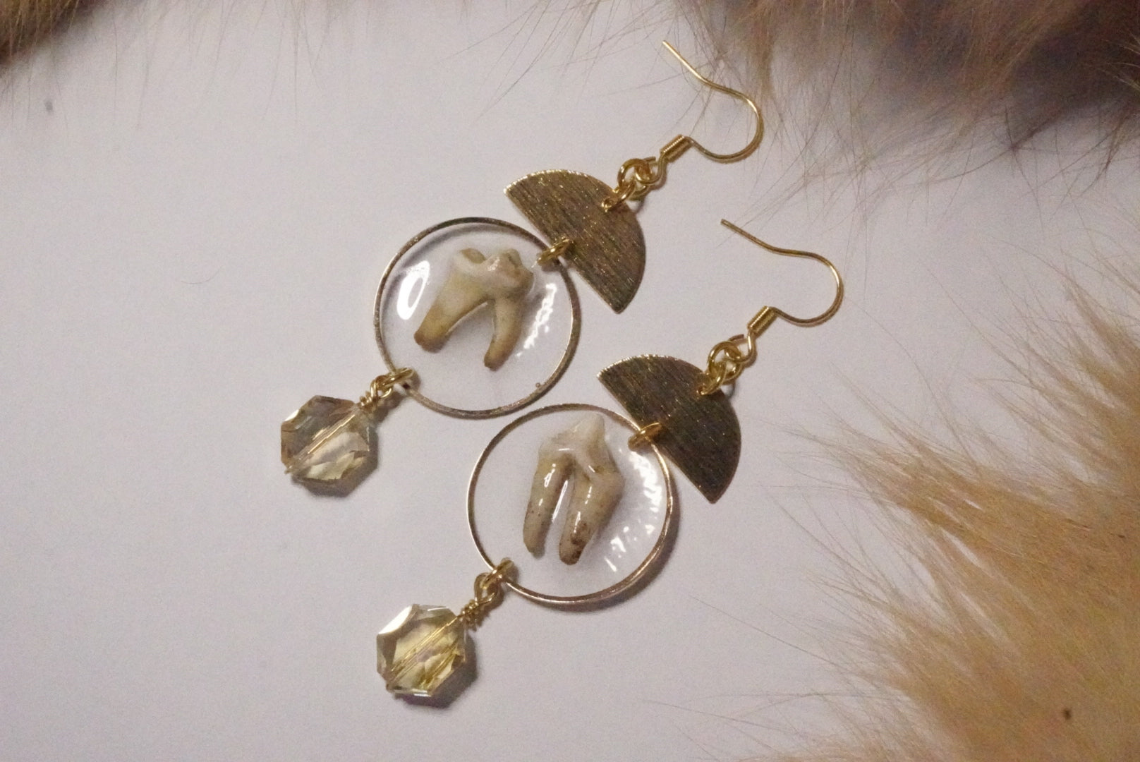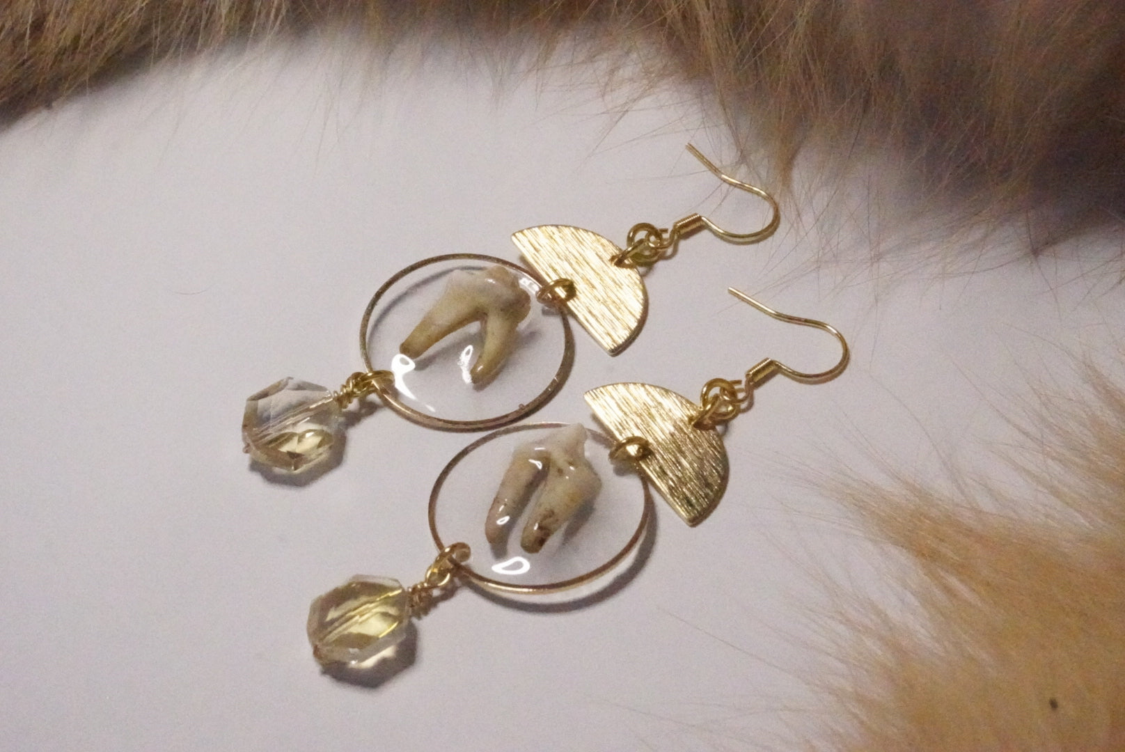 Striking coyote teeth earrings adorned with shimmery glass charms. Authentic natural materials meet iridescent accents for a bold, distinctive look that captures wild elegance.