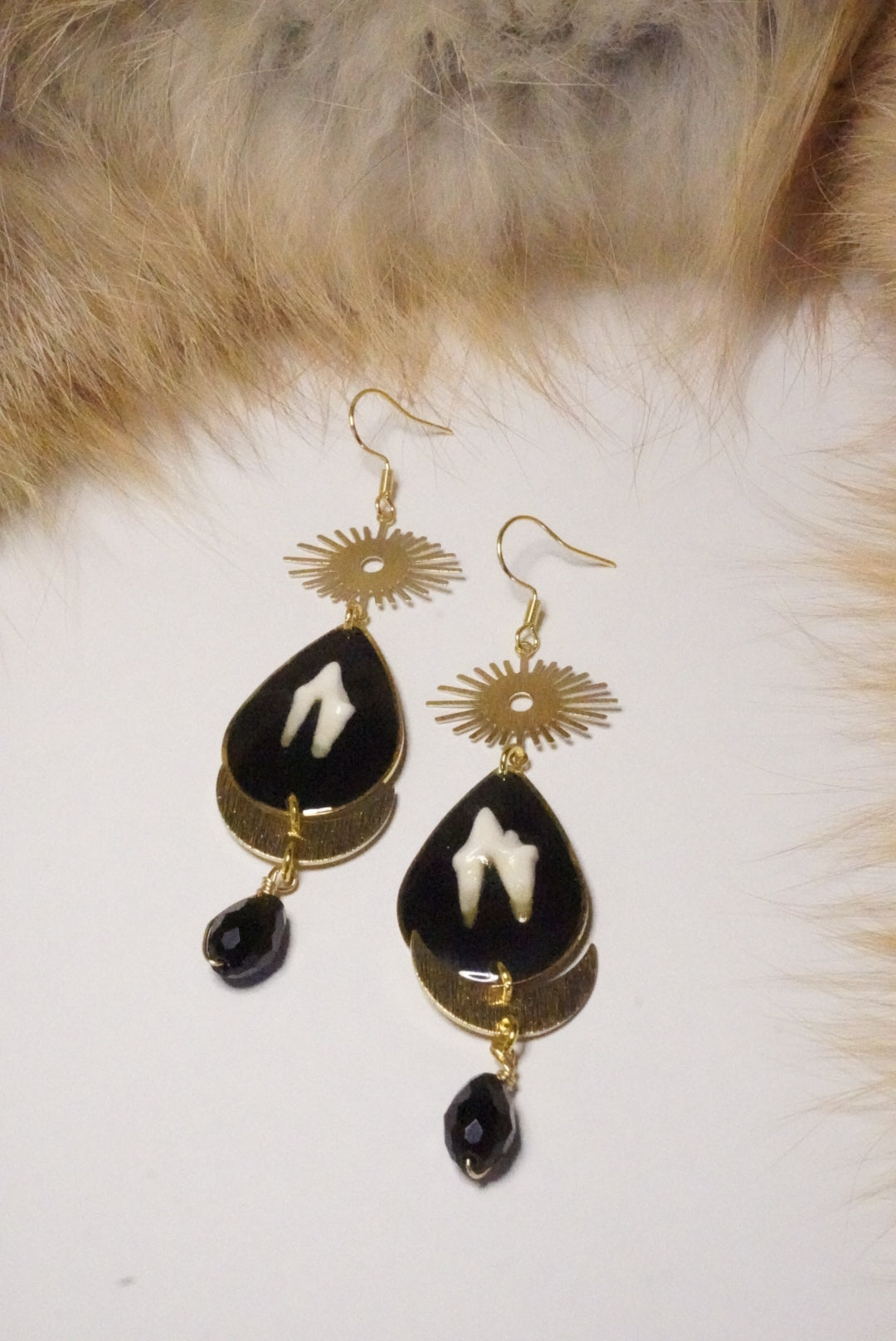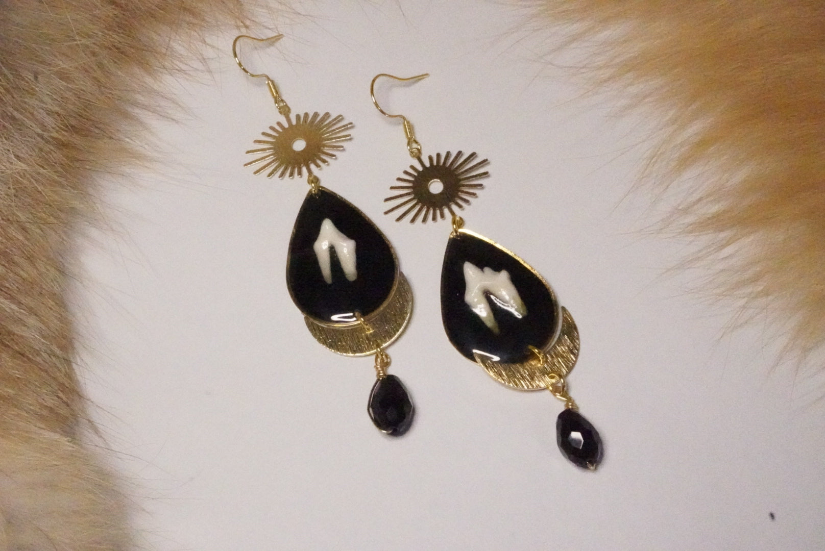 Fox teeth earrings feature celestial gold-toned charms paired with a striking black glass bead that creates elegant movement with every wear. The delicate gold detailing captures light beautifully, while the contrasting black bead adds depth and visual interest. Perfect for those who appreciate nature-inspired jewelry with a touch of celestial mystique. These statement pieces balance boldness with refinement, making them versatile enough for both everyday wear and special occasions.
