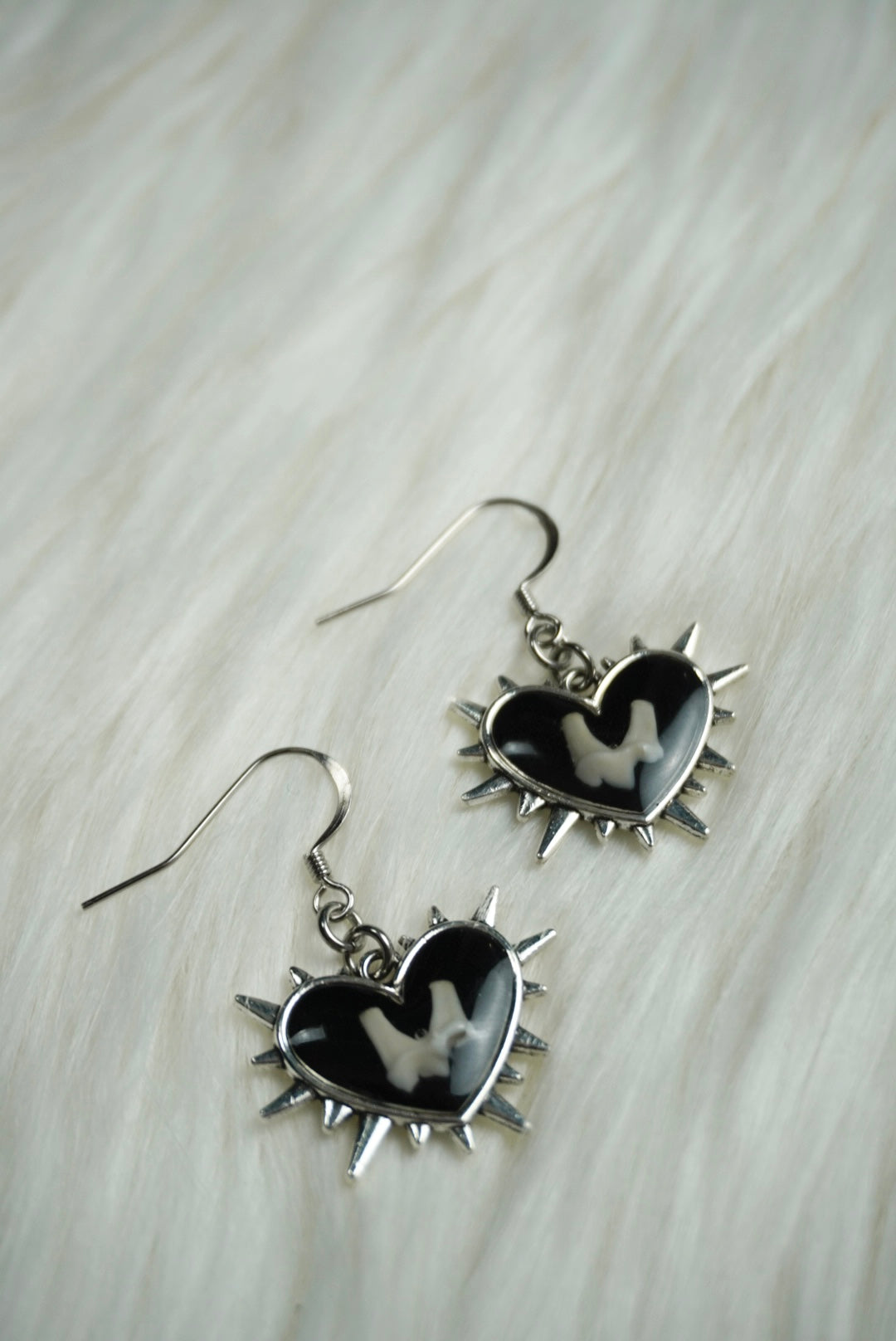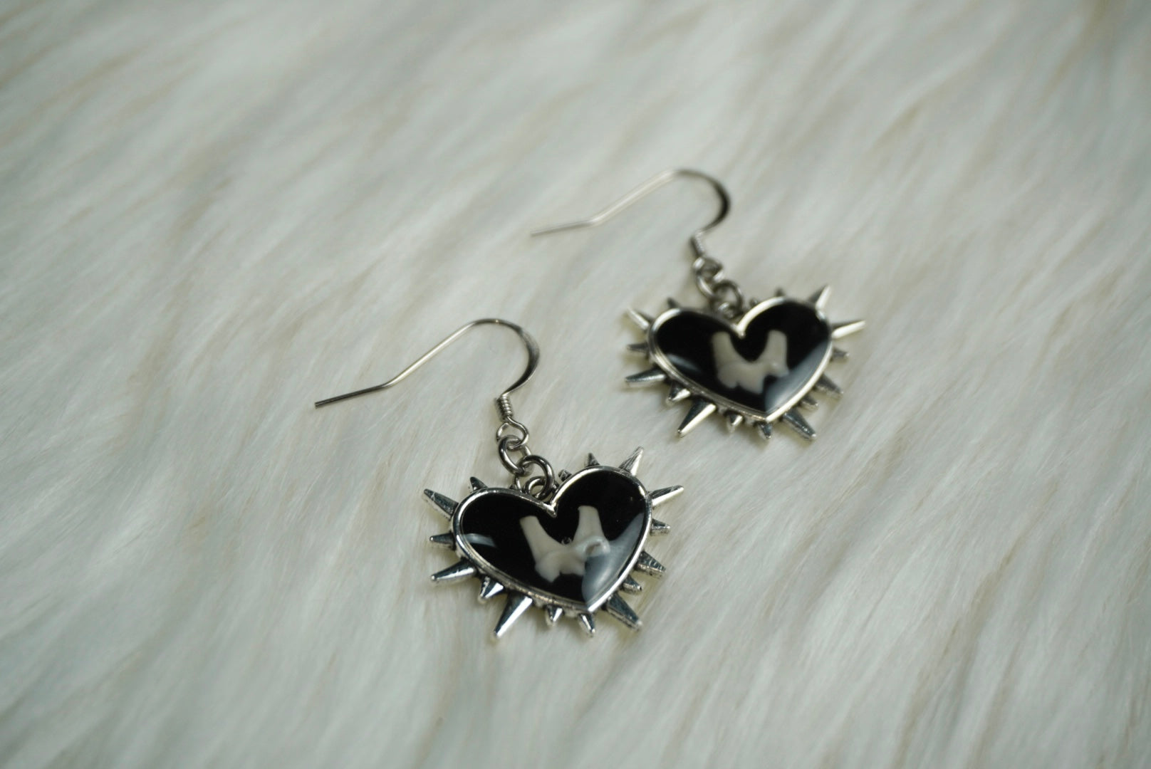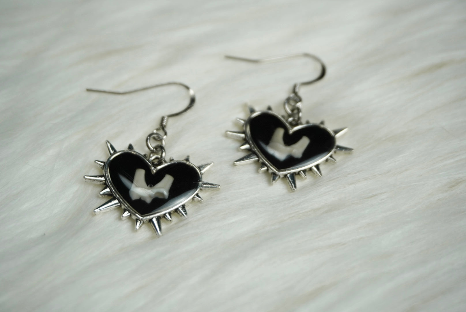 Edgy elegance meets artisanal craftsmanship in these striking handmade earrings. Heart-shaped silhouettes feature sharp spikes along the perimeter, delivering an unmistakable punk aesthetic. Each piece showcases carefully foraged natural materials nestled within the heart design, creating a distinctive textural contrast. Perfect for those who embrace bold, unconventional style without compromising on quality craftsmanship. A statement accessory that balances softness and edge.