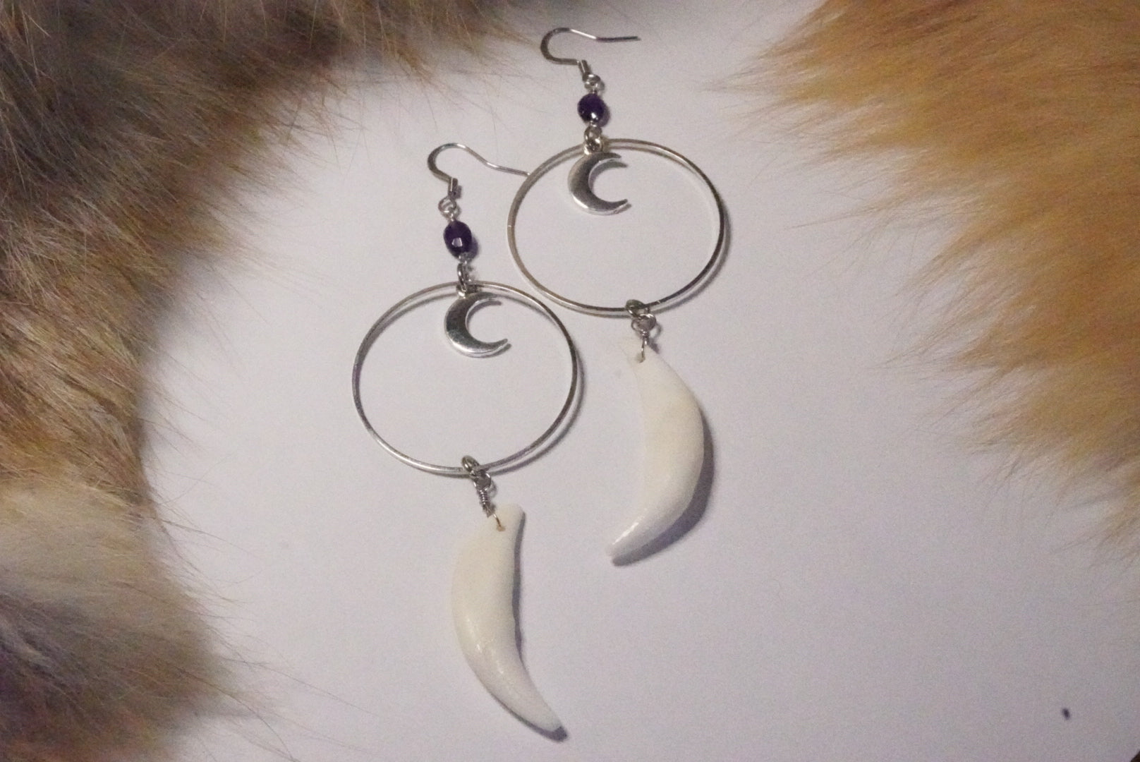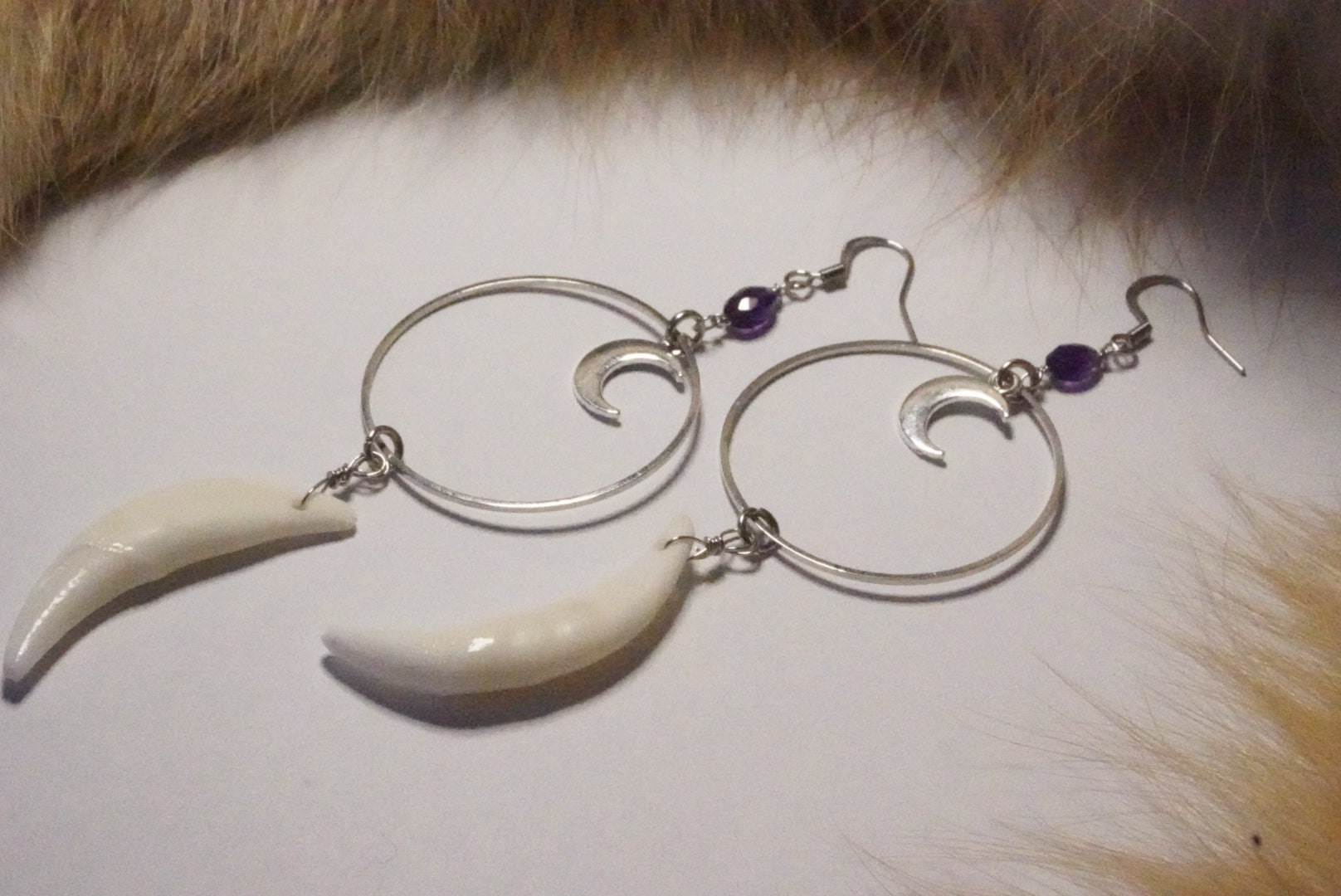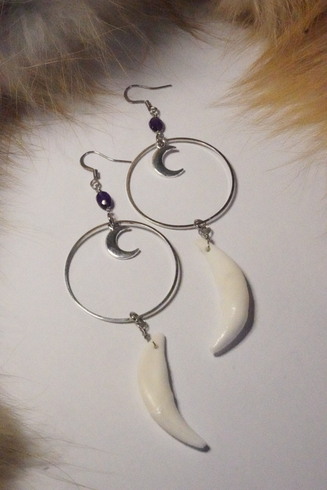 Authentic fox teeth earrings featuring surgical-grade stainless steel hooks, crescent moon charm, and natural amethyst stone. A distinctive piece blending raw elegance with spiritual symbolism.