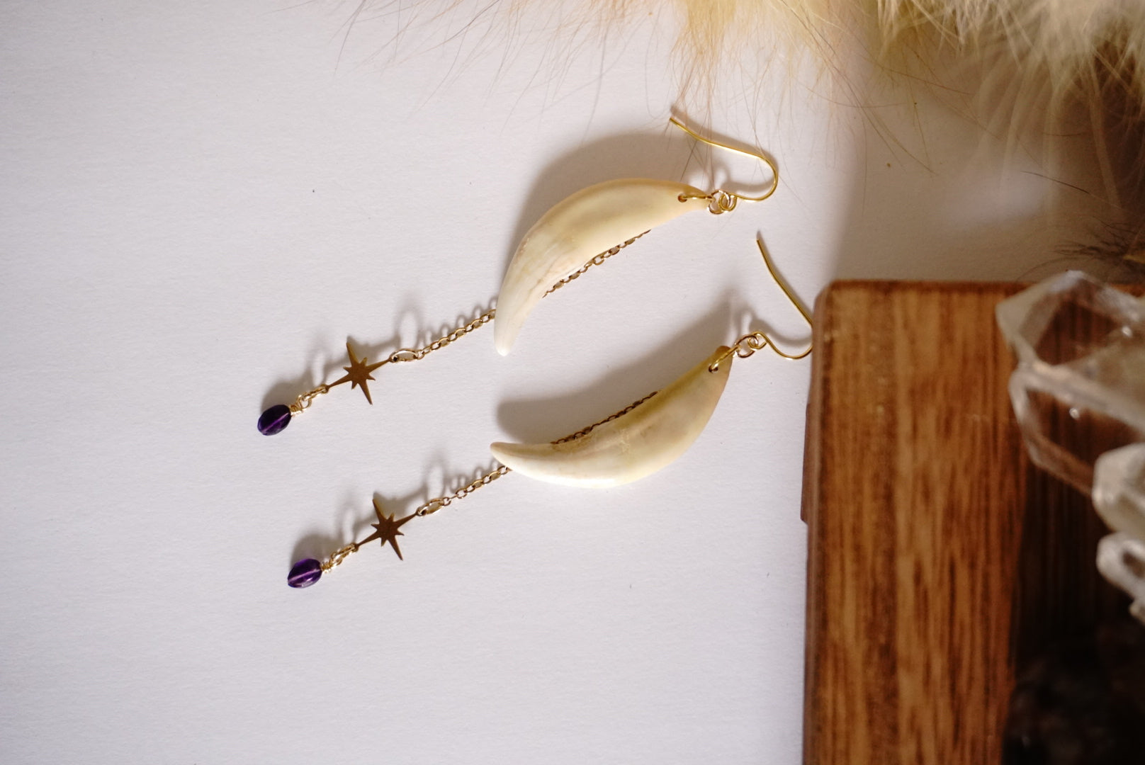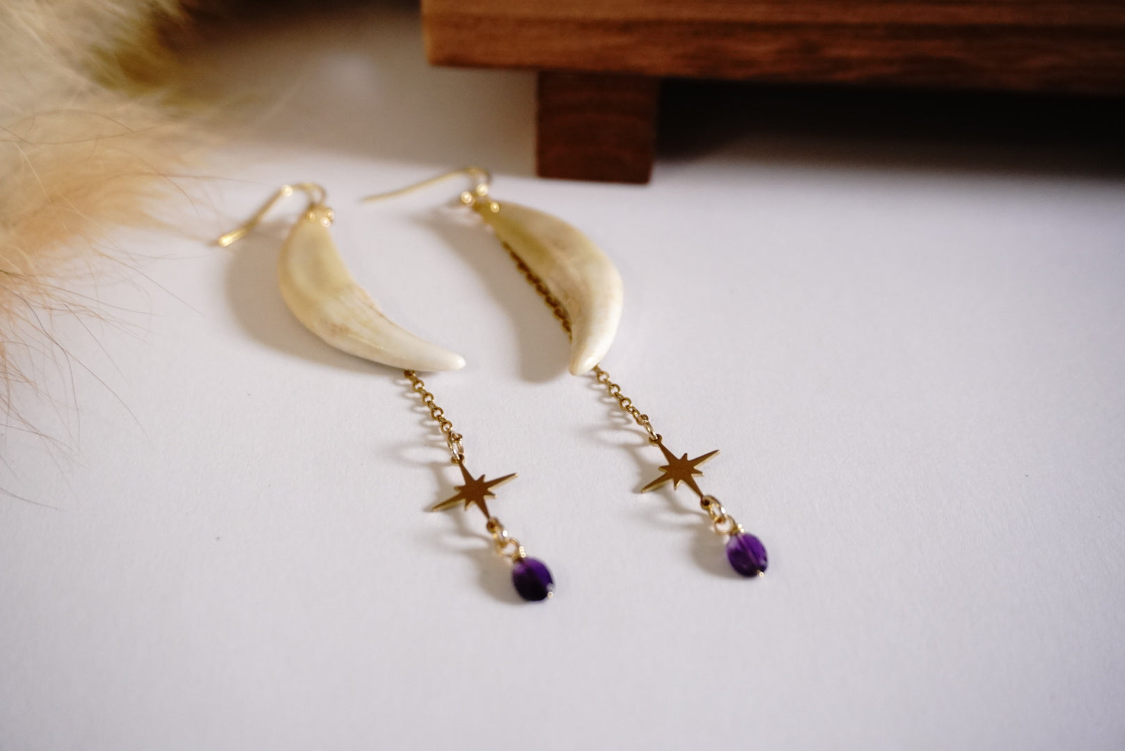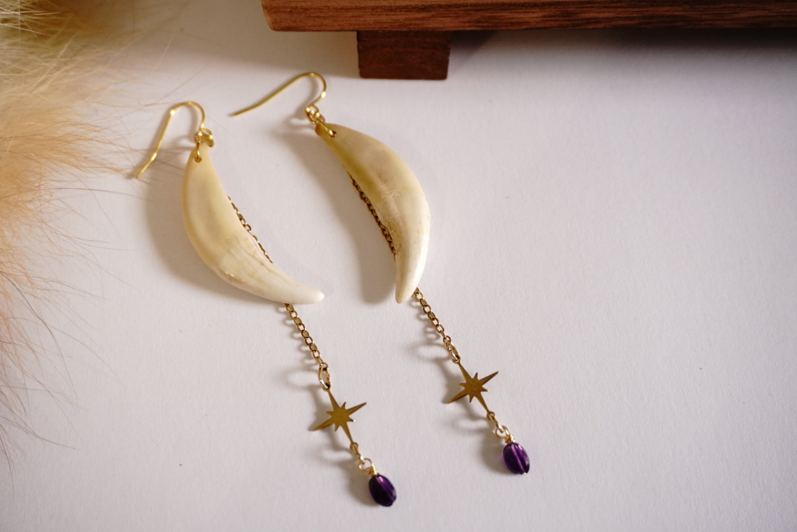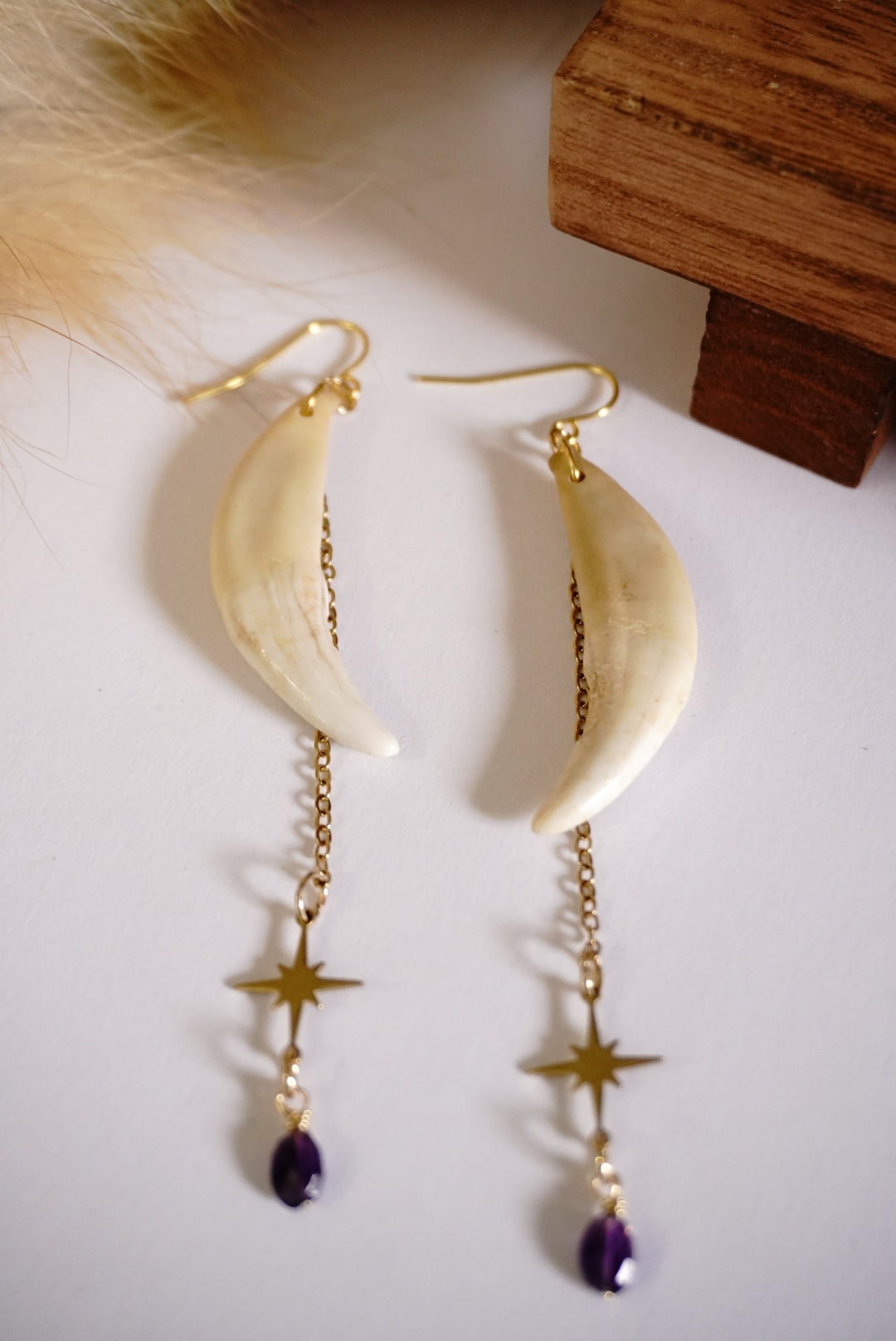 Dance on the wild side with these jaw-dropping handmade earrings! Real wolf teeth (yes, actual wolf teeth!) dangle playfully alongside genuine amethyst stones and twinkling gold star charms. Bold, powerful, and guaranteed to spark conversations – these aren't your average accessories! Warning: may cause spontaneous howling and compliments from strangers.