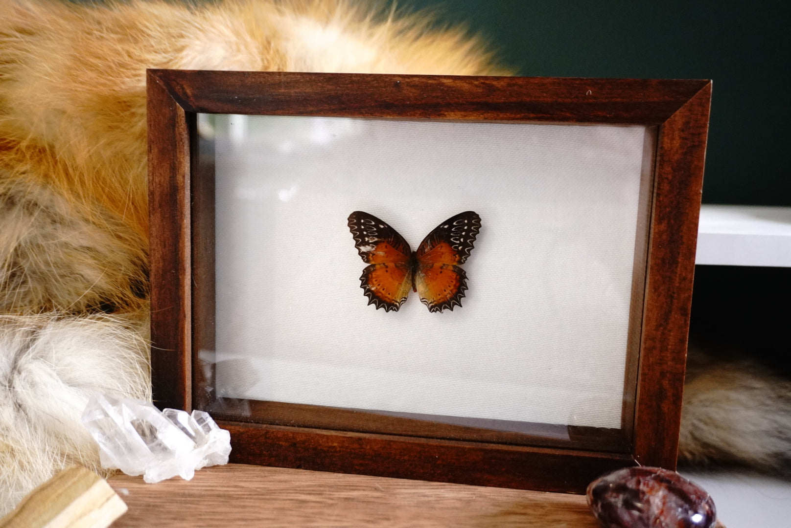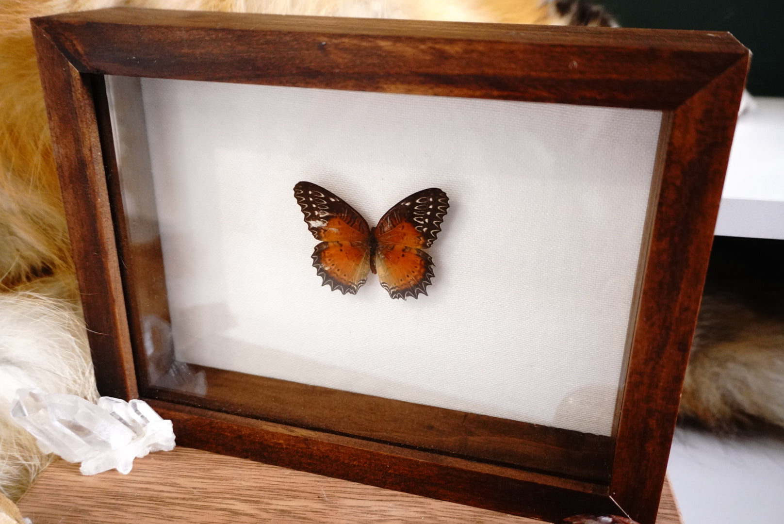 Bring the wild beauty of nature indoors with our Leopard Lacewing butterfly shadow box! This stunning specimen showcases the butterfly's distinctive spotted pattern and vibrant wings, perfectly preserved and artfully displayed. A playful pop of colour and pattern that transforms any wall into your personal butterfly garden.