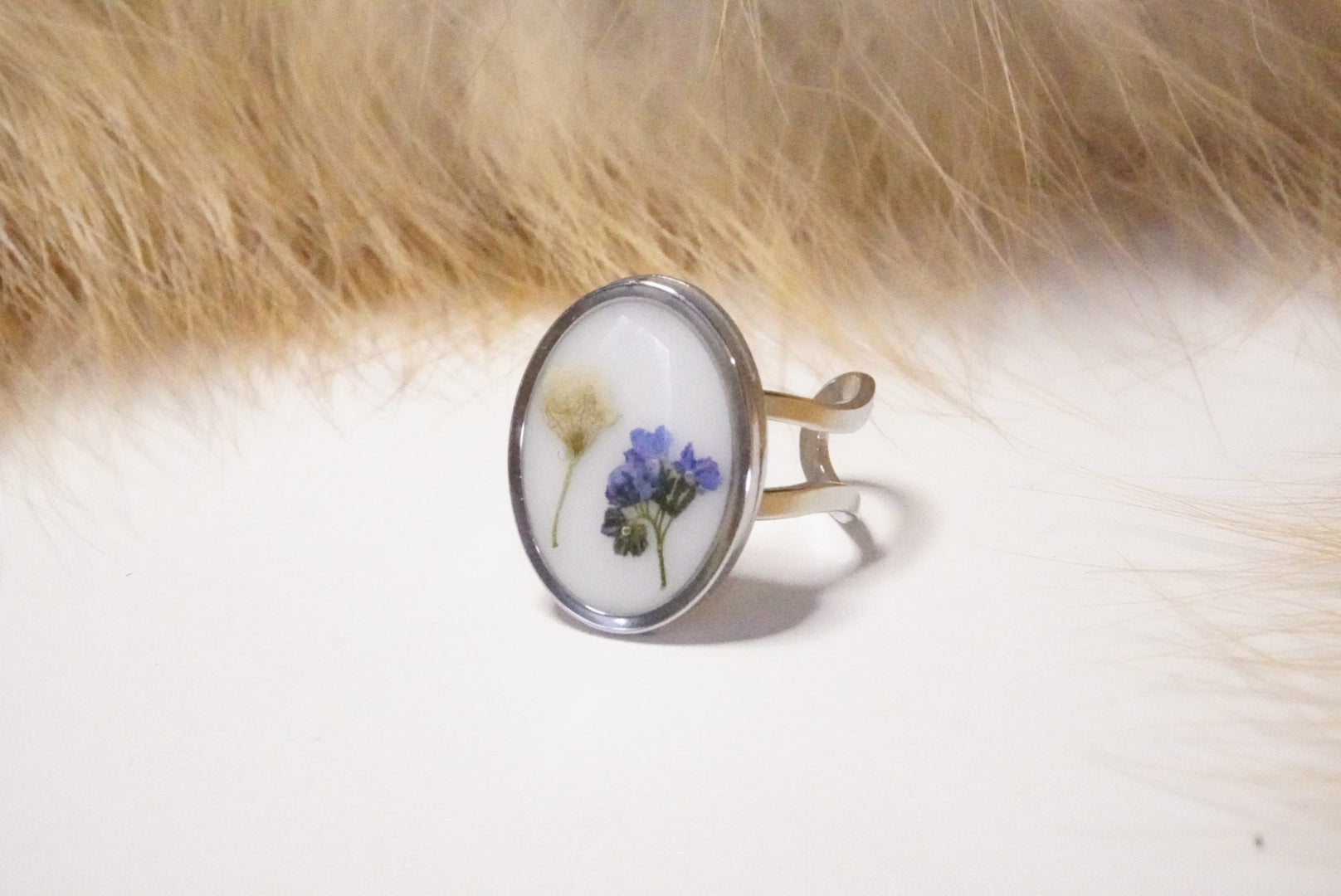 Carry the delicate beauty of a forget-me-not with you always. This adjustable ring features a genuine pressed flower suspended within a clear setting, creating a timeless keepsake that honours nature's gentle grace. Perfect for those seeking a meaningful connection to the natural world, this piece serves as a tender reminder of cherished memories and enduring bonds. The adjustable band ensures a comfortable fit for any hand, making it an ideal gift for someone special or a personal talisman of remembrance.