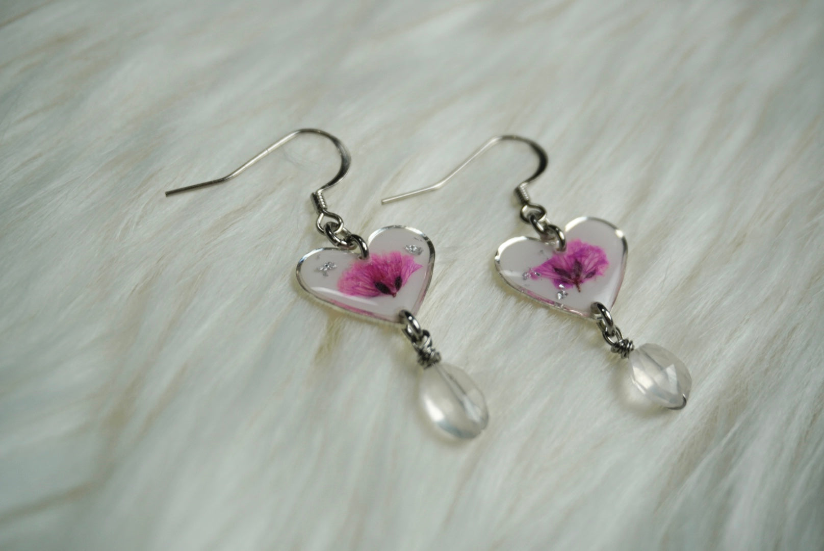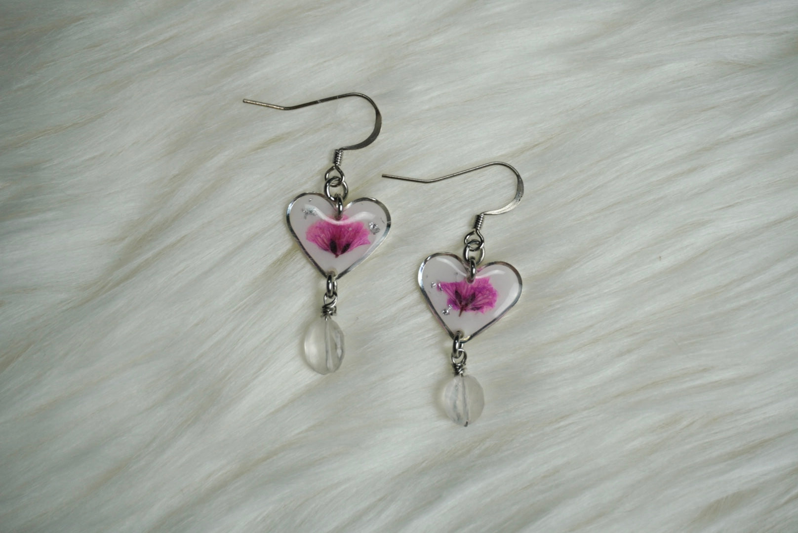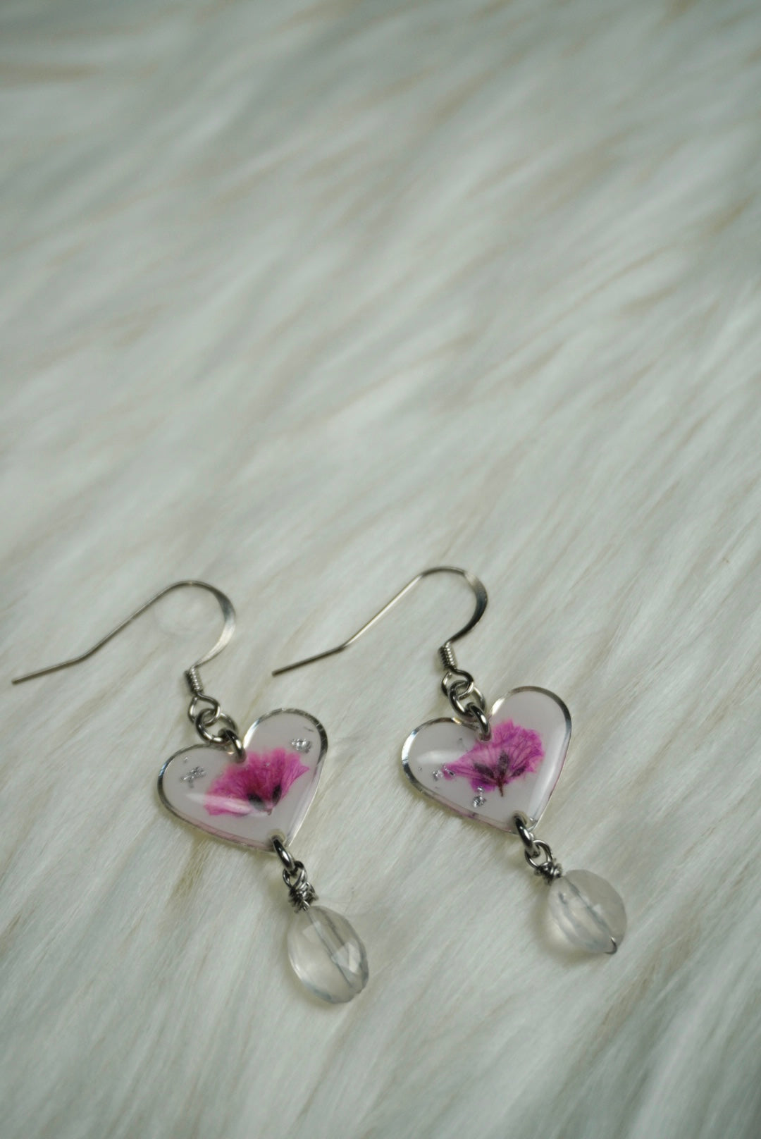 Celebrate love and nature with these enchanting handmade earrings. Each pair features delicate pressed flowers preserved beneath a protective layer, paired with a soothing clear quartz stone. Perfect for those who cherish botanical beauty and meaningful accessories, these heart-shaped pieces bring a touch of natural elegance to any look. A thoughtful gift for yourself or someone special who appreciates artisanal craftsmanship and the gentle energy of crystals.