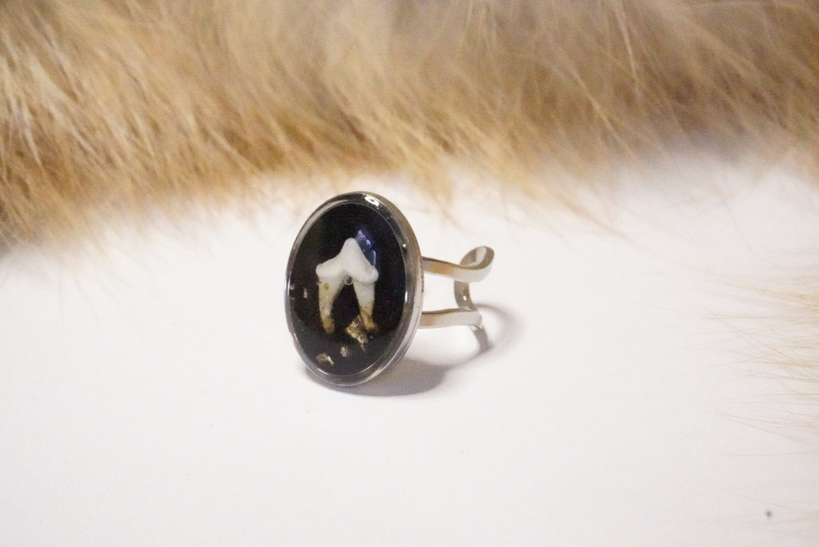 Crafted from genuine raccoon tooth, this adjustable ring merges natural elegance with practical design. The authentic material resists tarnishing and won't discolor your skin, ensuring lasting wear without maintenance concerns. Its versatile sizing accommodates various finger widths, making it an effortless addition to any collection. A distinctive piece that celebrates nature's raw beauty with understated refinement.