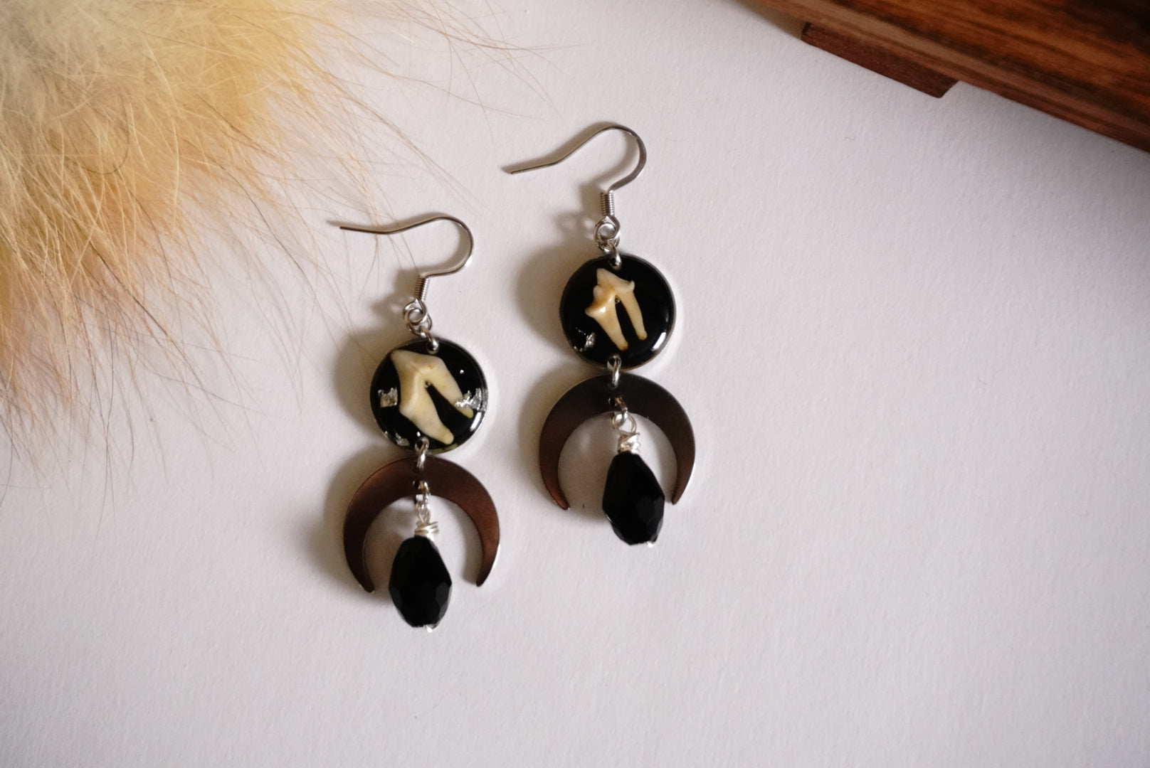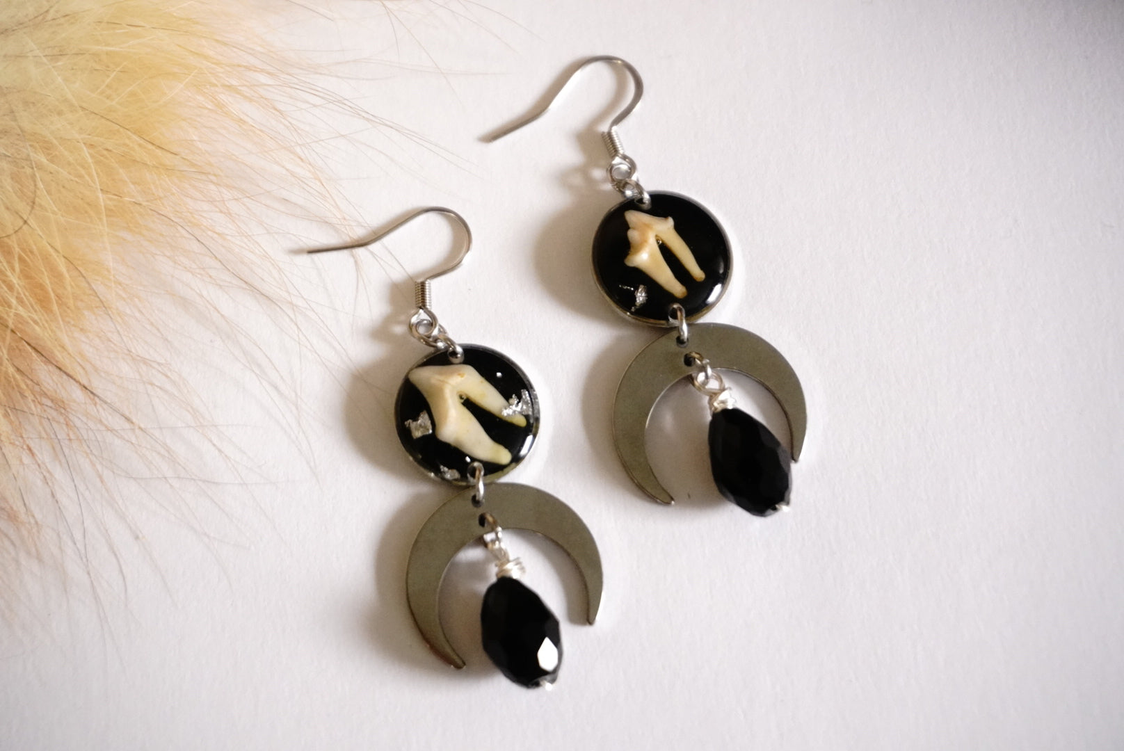 Embrace your wild side with these uniquely captivating earrings! Each pair features authentic raccoon teeth thoughtfully paired with delicate crescent moon charms. The finishing touch? A mysterious black glass bead that dangles playfully below. Perfect for nature lovers, oddity collectors, or anyone looking to make a conversation-starting statement!