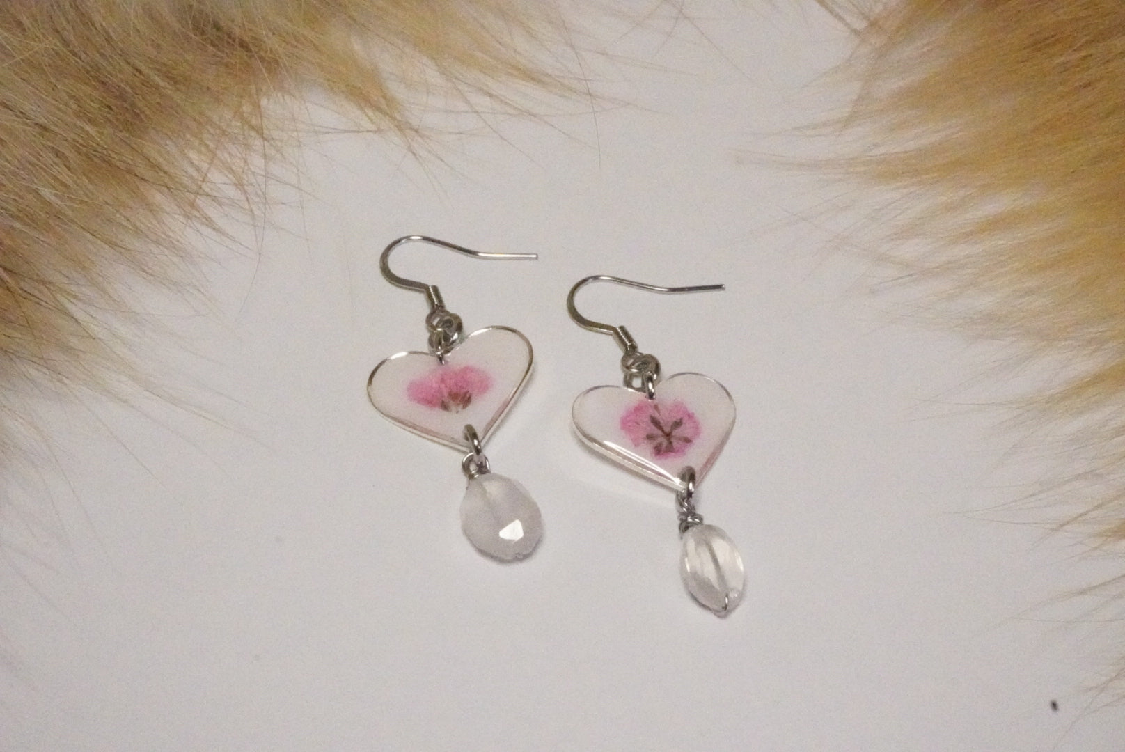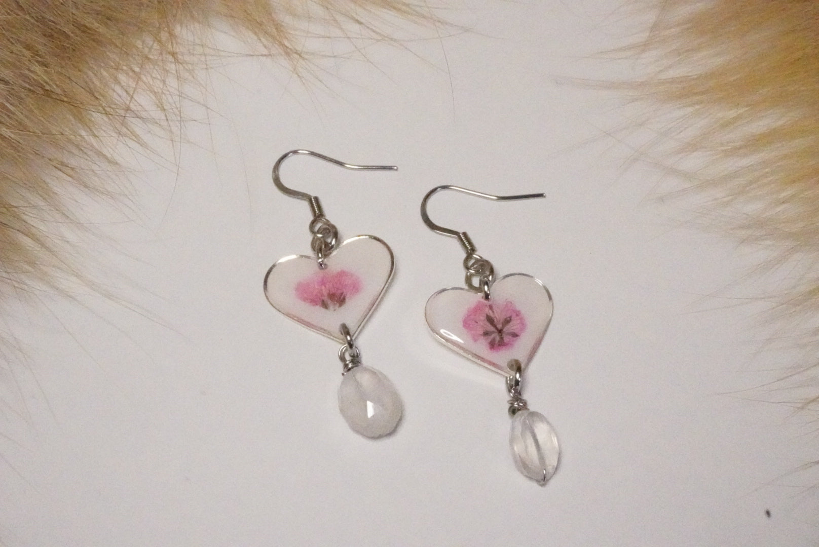 Expertly crafted heart-shaped earrings showcasing a preserved pink flower at their core, complemented by a suspended clear quartz drop. Built on medical-grade stainless steel hooks, these pieces deliver both aesthetic appeal and practical durability for everyday wear. The botanical element combined with natural quartz demonstrates superior attention to detail, making them a sophisticated choice for discerning customers who value authentic materials and refined artisanal construction.