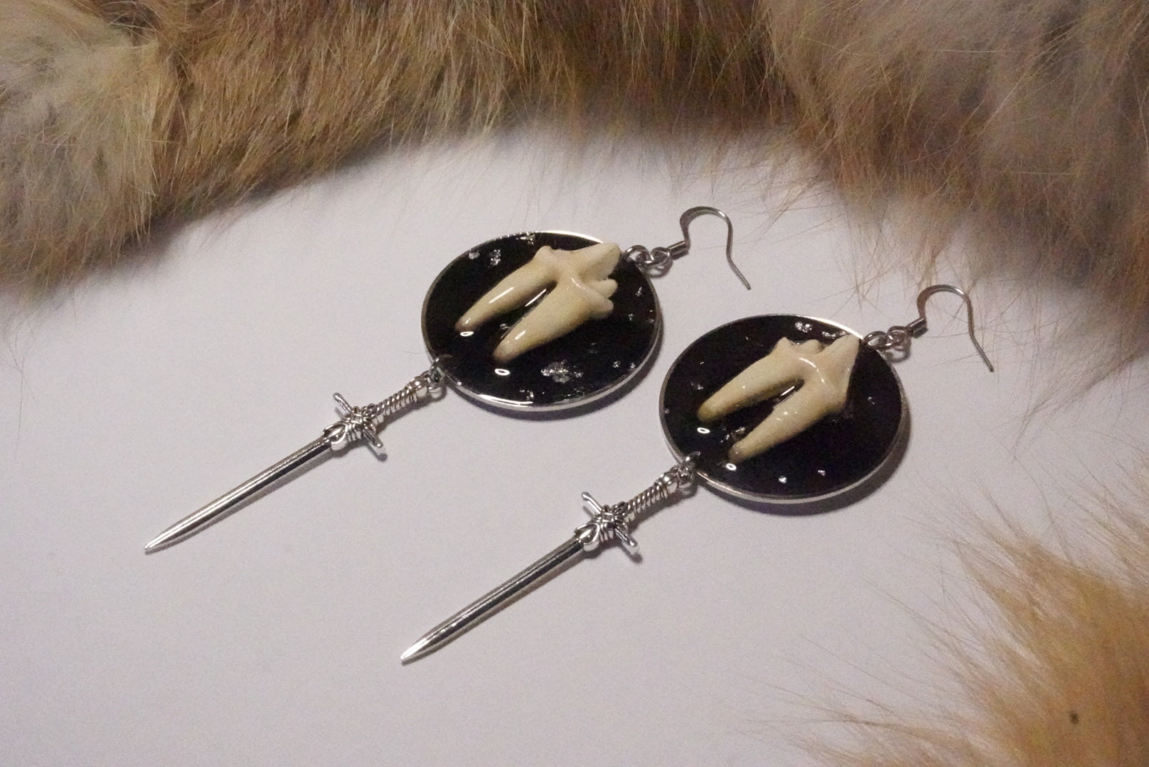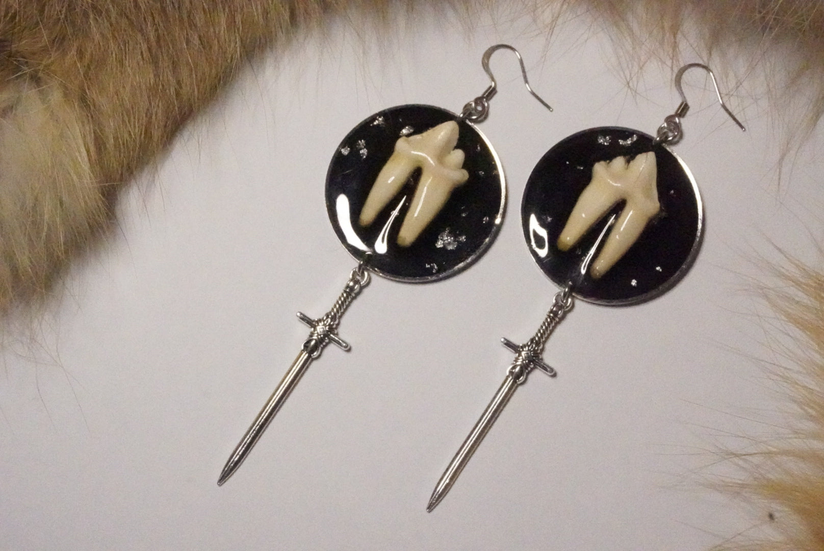 Bold wolf tooth earrings featuring a suspended dagger charm. Crafted on stainless steel hooks for lasting wear. Make an unforgettable impression with these striking, nature-inspired pieces that showcase your fearless style.